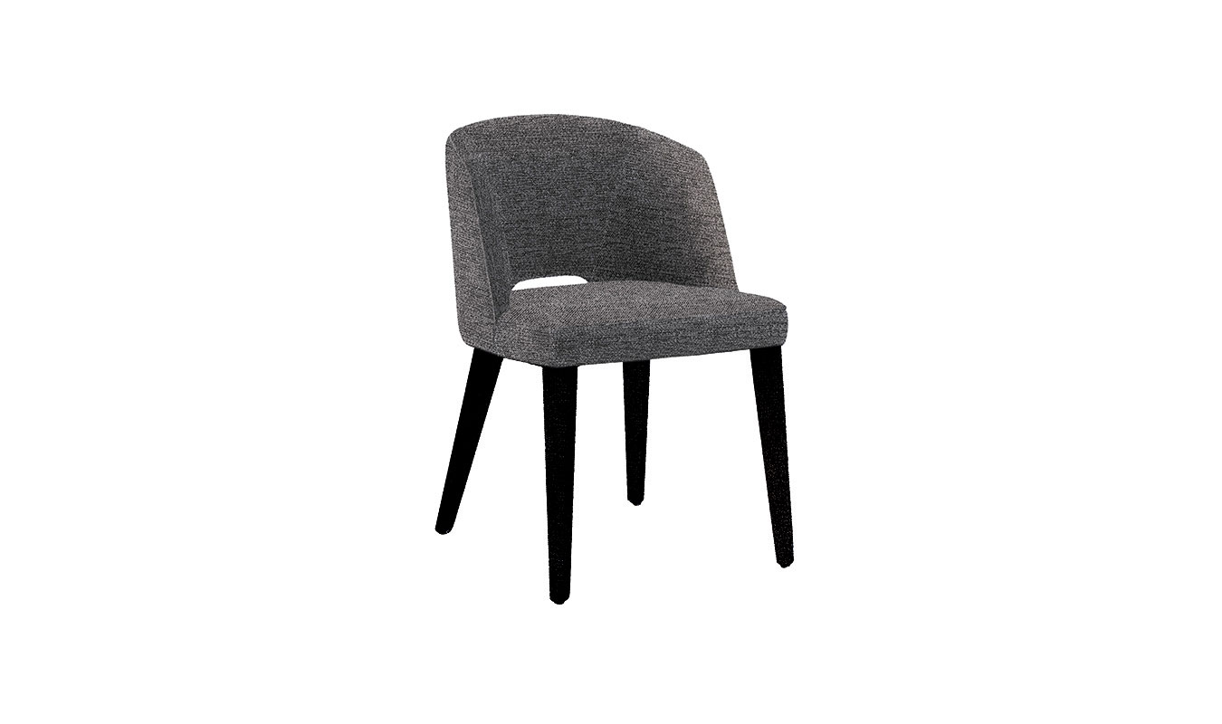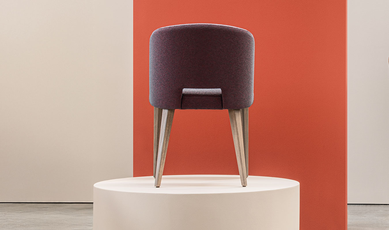 The soft and welcoming shapes of the seat and backrest, both upholstered, rest on the wooden structure.