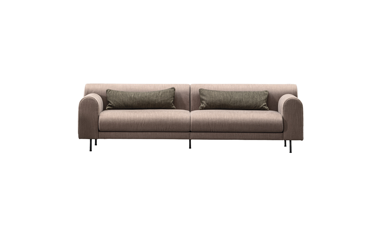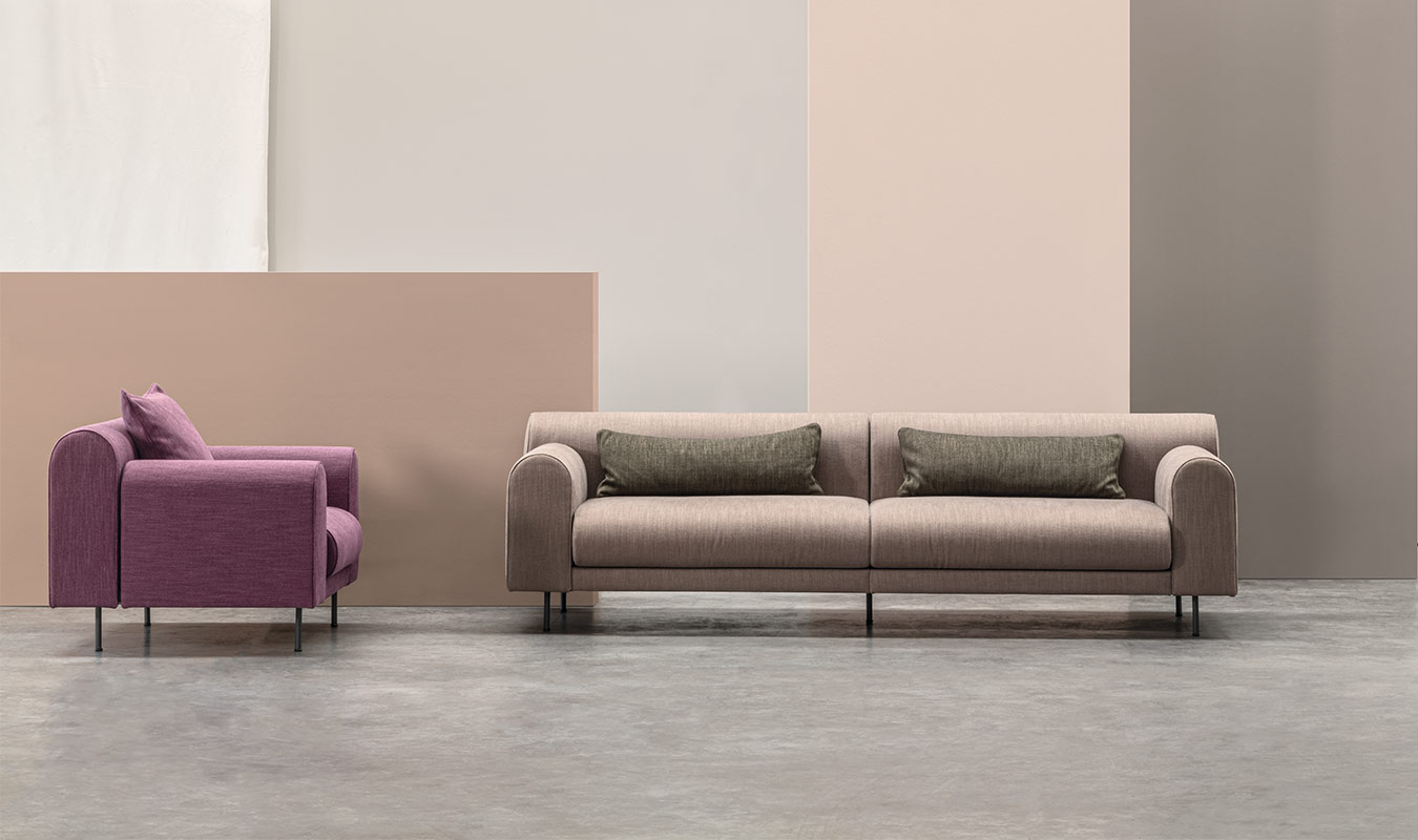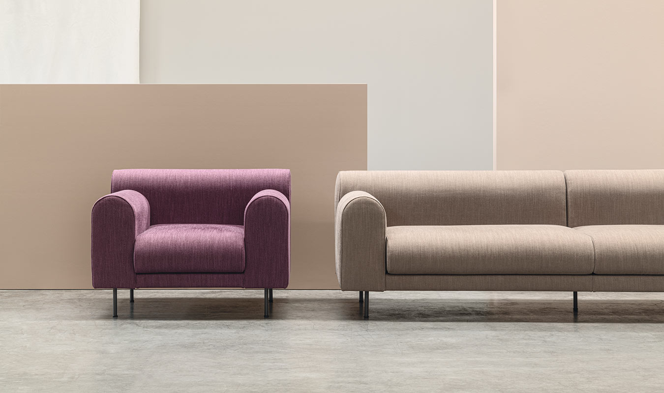 A sofa with a metal base and frame. A round arch defines the generous volumes and contact joints between the backrest and armrests.