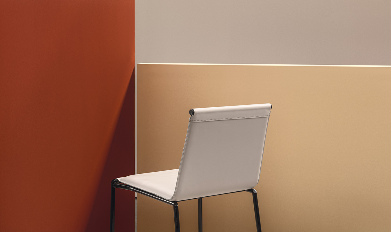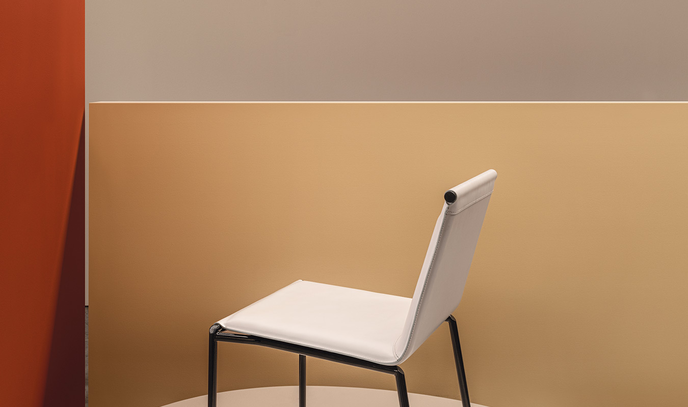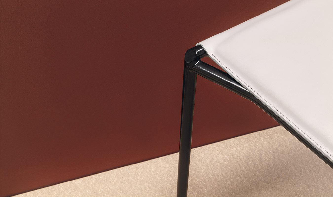 A chair with upholstered seat and back in one piece. The aesthetics is characterized by simple lines that are enhanced by the many refined details of the metalworking.