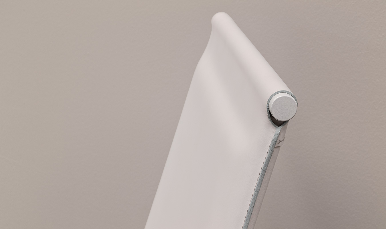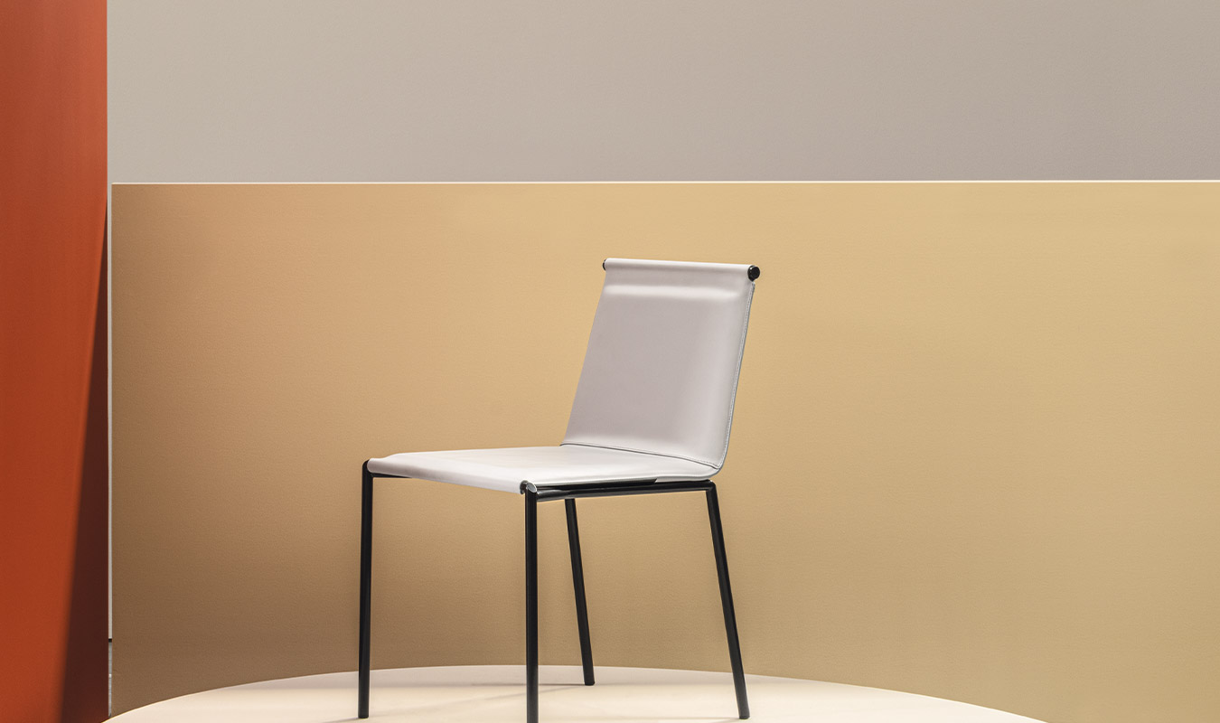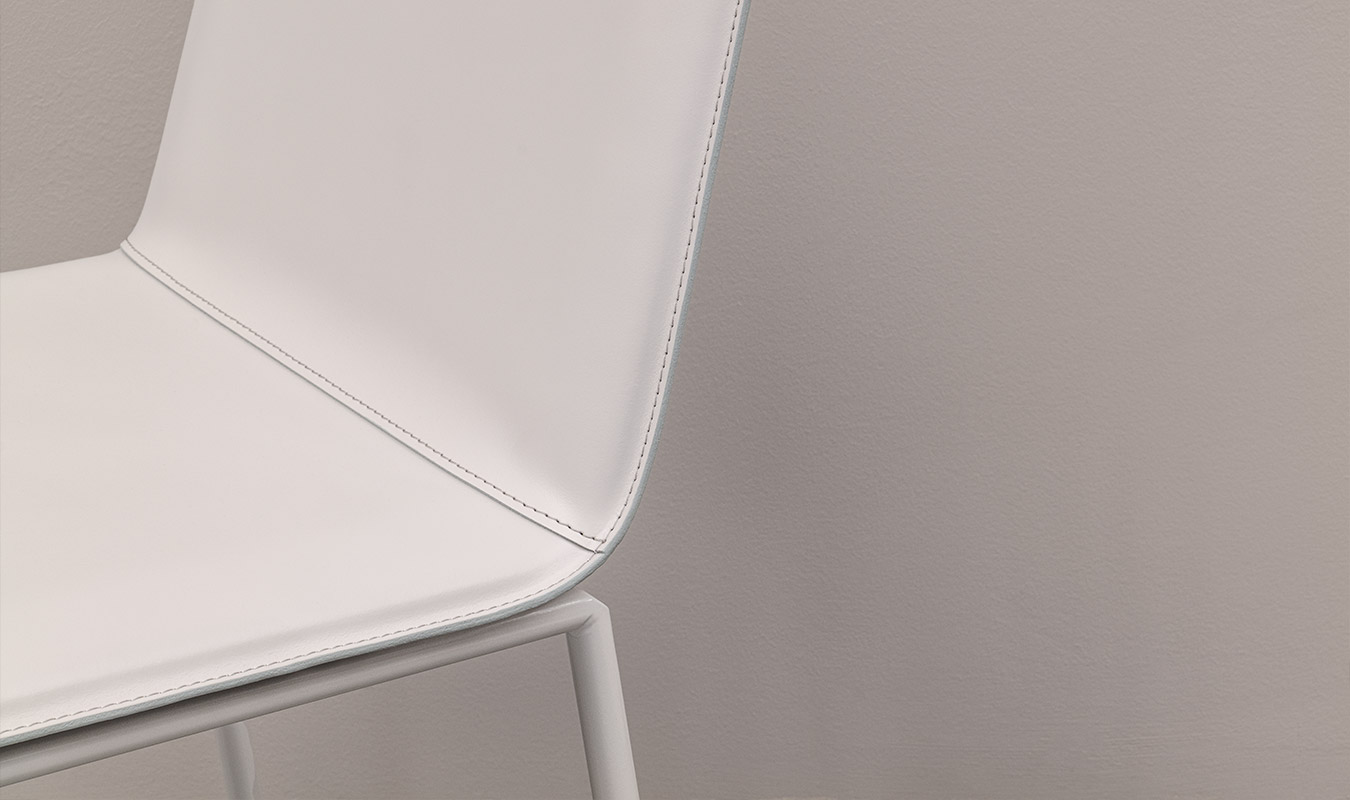 A chair with upholstered seat and back in one piece. The aesthetics is characterized by simple lines that are enhanced by the many refined details of the metalworking.