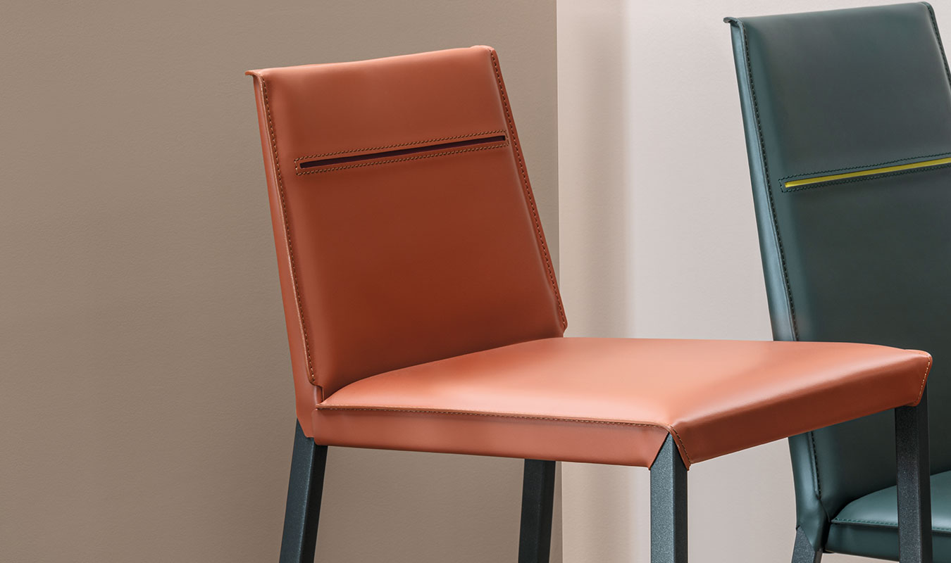Comfortable and thin, Lolas is a stylish and playful seat. The top of the backrest features a contrasting leather insert. For an explosion of color that one can’t get enough of.