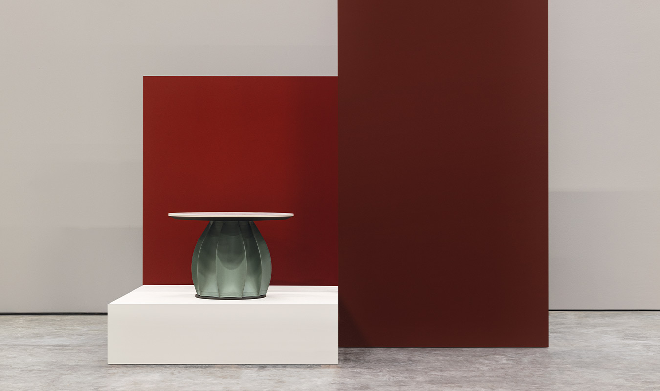 The decorative surface of the side table base is made of Italian leather. The decorative leather is handcrafted and the base is shaped like an elegant and attractive skirt.