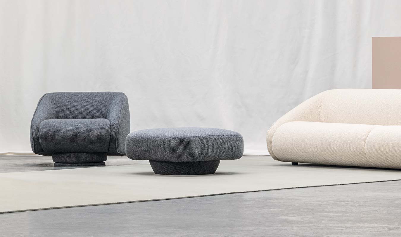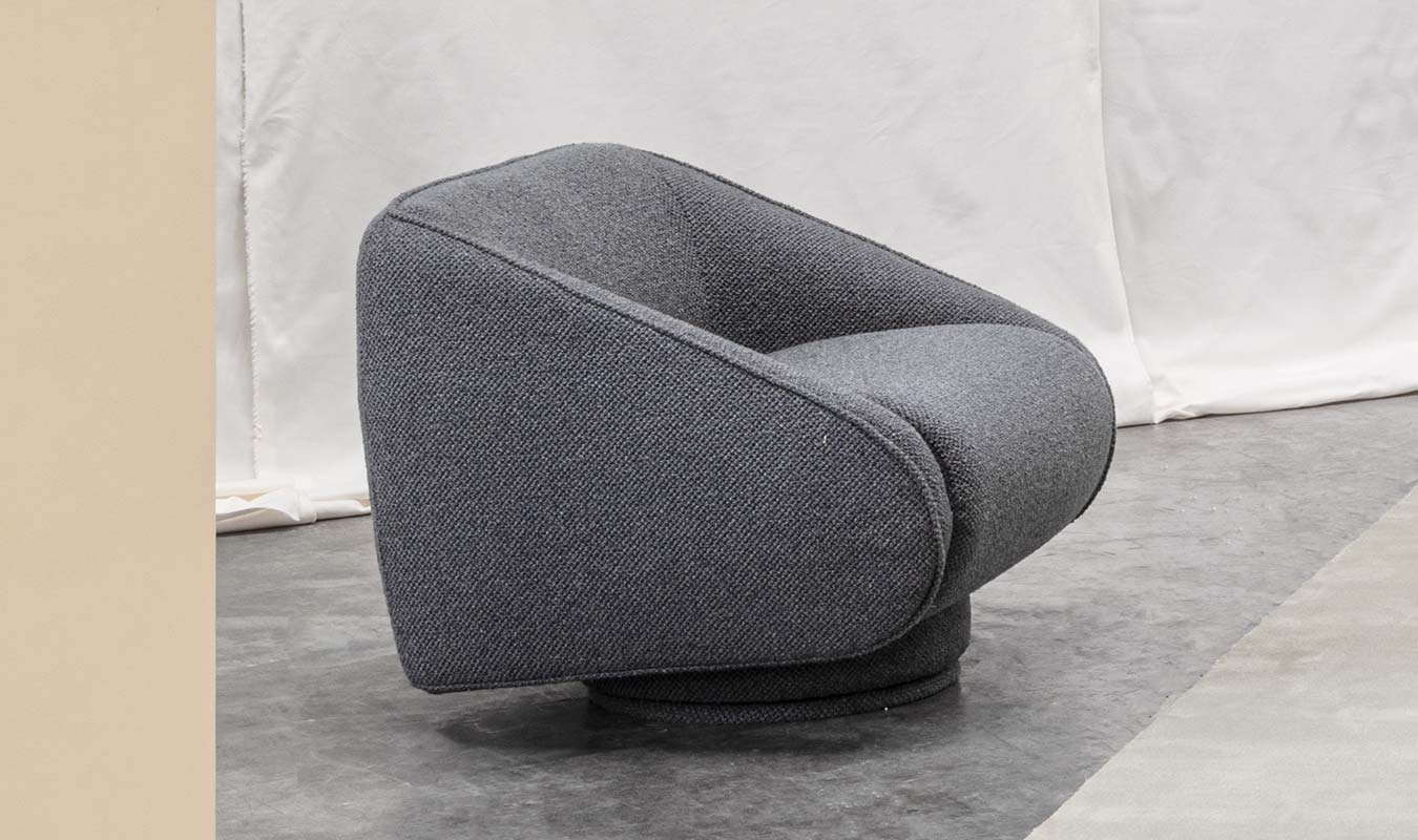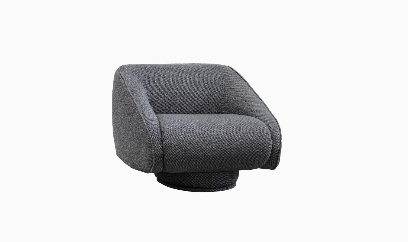 Swivel armchair with a contemporary look. Its soft and simple aesthetics immediately convey a sense of comfort and harmony. It matches perfectly with the pouff, which can also be used as an independent accessory.