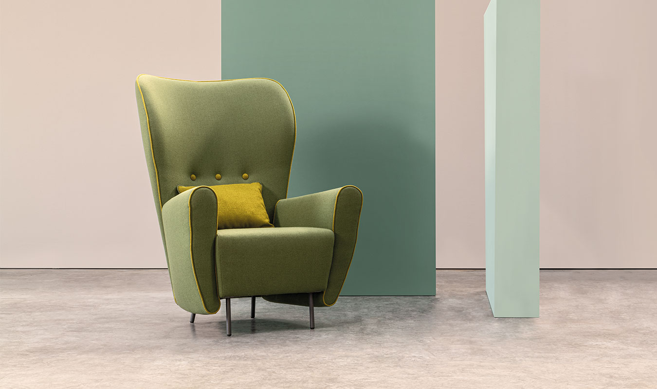 Fabrics combined with hammered and galvanised bronze-effect metal feet make Wes an elegant and sophisticated armchair. The voluptuous shapes are emphasised by elegant piping.