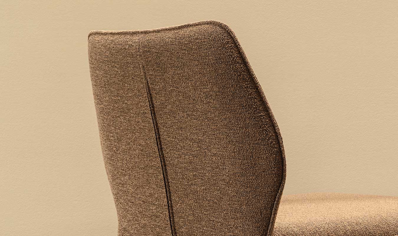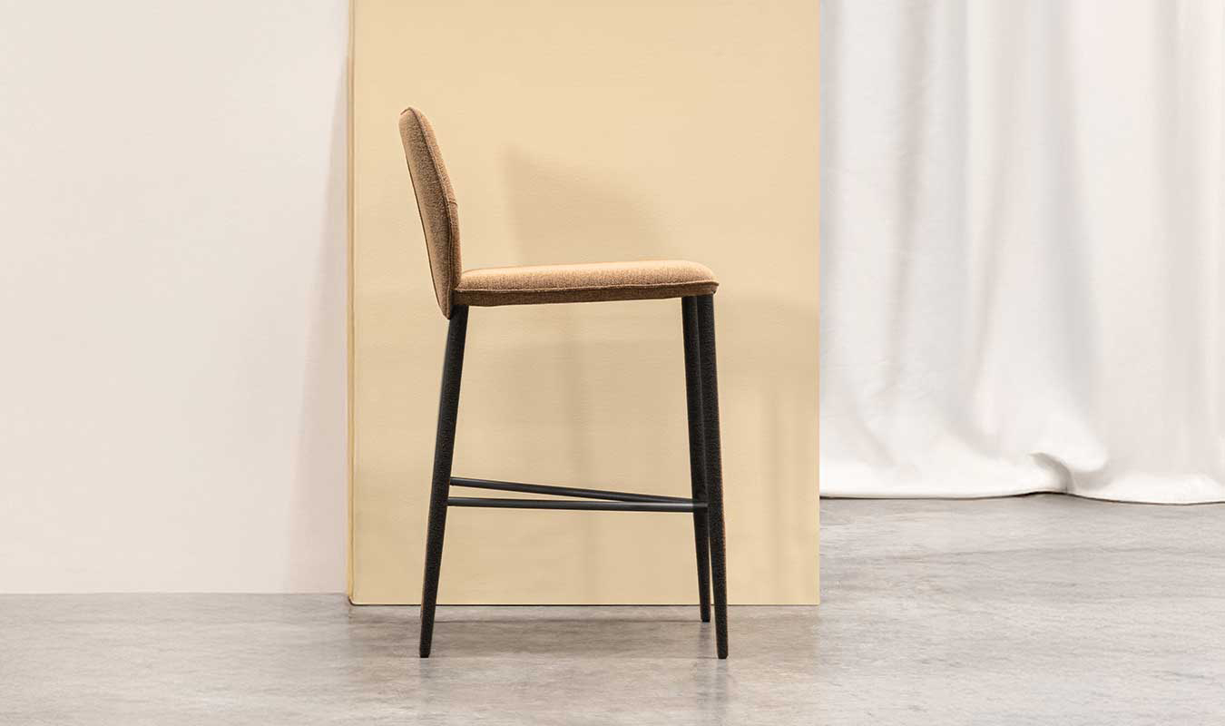 Minimalist look and curved silhouette for Wind, a stool covered with soft leather and fabric whose enveloping seat is the main character trait available with metal coated legs.