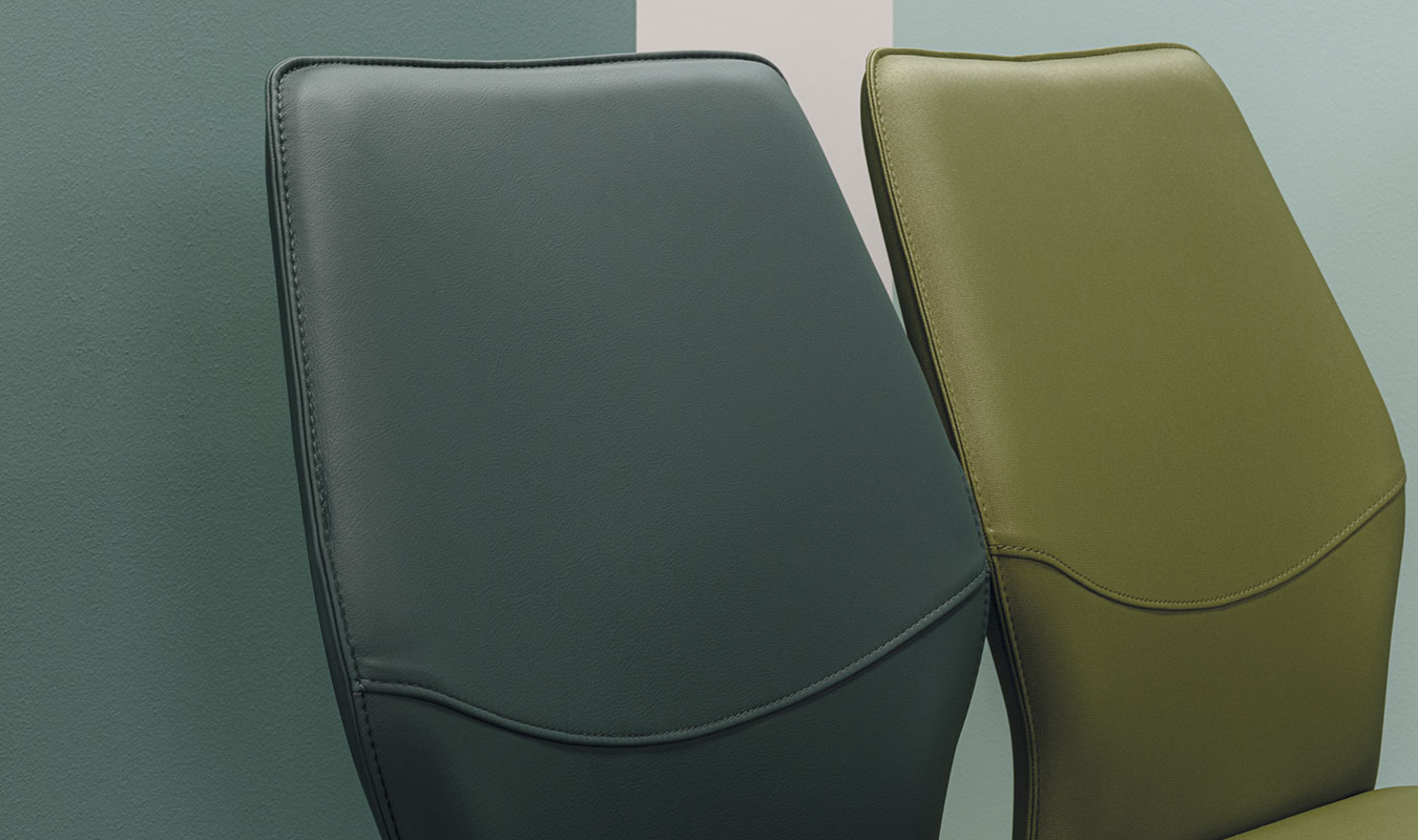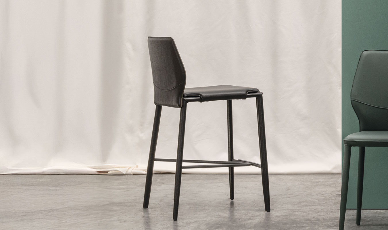 Minimalist look and curved silhouette for Wind, a stool entirely covered with leather and whose enveloping seat is the main character trait.