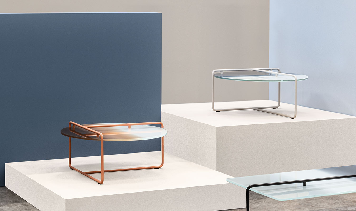 Gruppo di tavolini concepiti come esoscheletri leggeri che sostengono i piani rimanendo apparentemente sospesi. I piani sono in vetro verniciato a caldo con effetti di finitura sfumati.